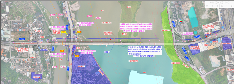 羅浮山大橋改建工程推薦采用保留改建方案,路線起點(diǎn) K0+000 接順惠州市博羅縣石灣鎮(zhèn)橋北側(cè)永石大道的舊路中線位置處,之后向東側(cè)偏出,平行于舊橋呈南北分布依次跨過沙河及東江,在東莞側(cè)設(shè)計(jì)線逐漸靠近舊路中線,并與原引道段接順拼寬落地,之后路線終點(diǎn)位置 K2+100 接順東莞側(cè)東園大道,另外在橋梁北側(cè)設(shè)置四條上下橋匝道 A、B、C、D,位于東江與沙河之間接既有雙向四車道環(huán)島路。項(xiàng)目主線全長約 2.1km